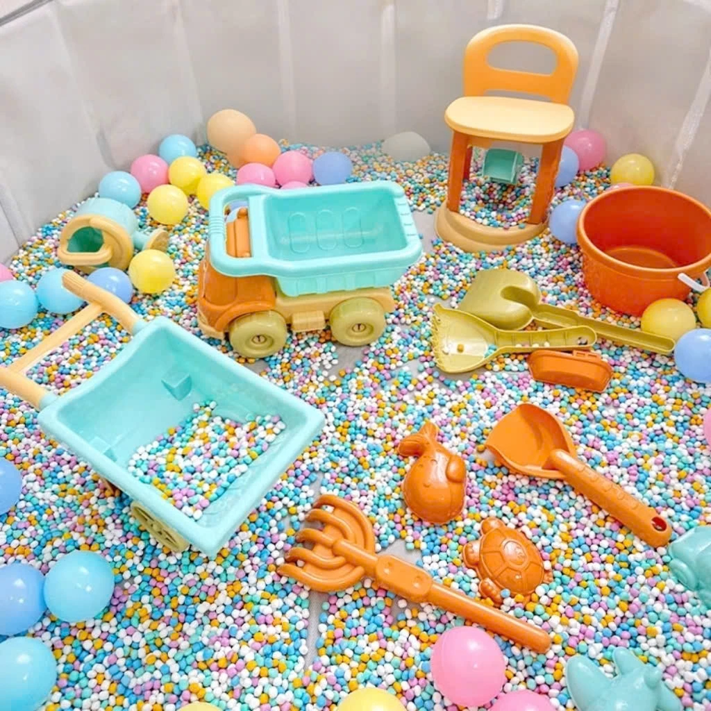 Hạt nhỏ, nhẹ, dễ xúc – phù hợp cho các hoạt động như xúc cát, xây mô hình, chơi đồ hàng… giúp bé thao tác dễ dàng.